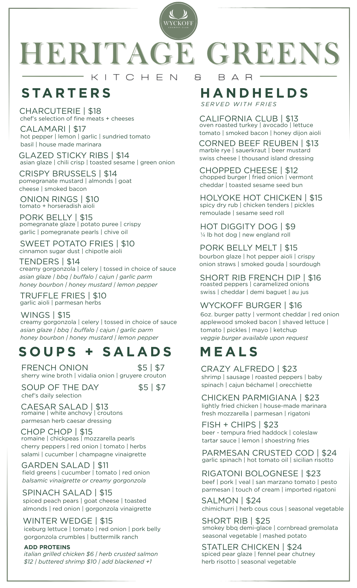 Welcome to Heritage Greens Kitchen & Bar, the newly imagined restaurant at Wyckoff Country Club, offering a fresh and elevated dining experience in a beautiful setting.